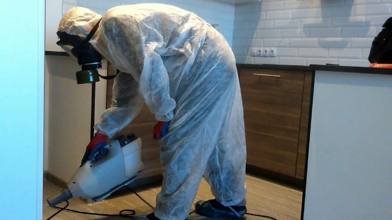 специалист проводит дезинсекцию в квартире, где живут животные